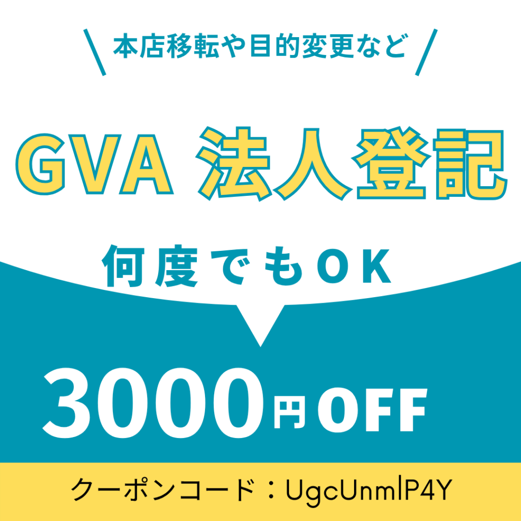 GVA法人登記ご利用時に、当事務所専用クーポンコードを入力すると3,000円割引でご利用いただけます!